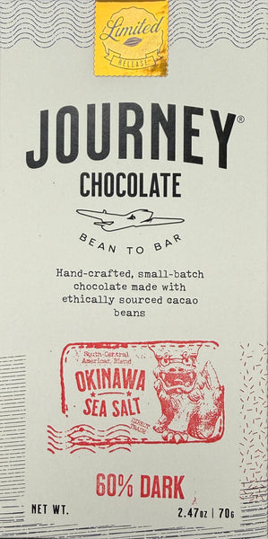 The salt is sourced from the pristine waters off the coast of Okinawa, Japan, sought around the world for its unique and gentle flavor that enhances dishes of all types. Crafted with a special blend of cacao from South and Central America, we sprinkle a generous amount of salt on the bottom of the bars during our molding process.